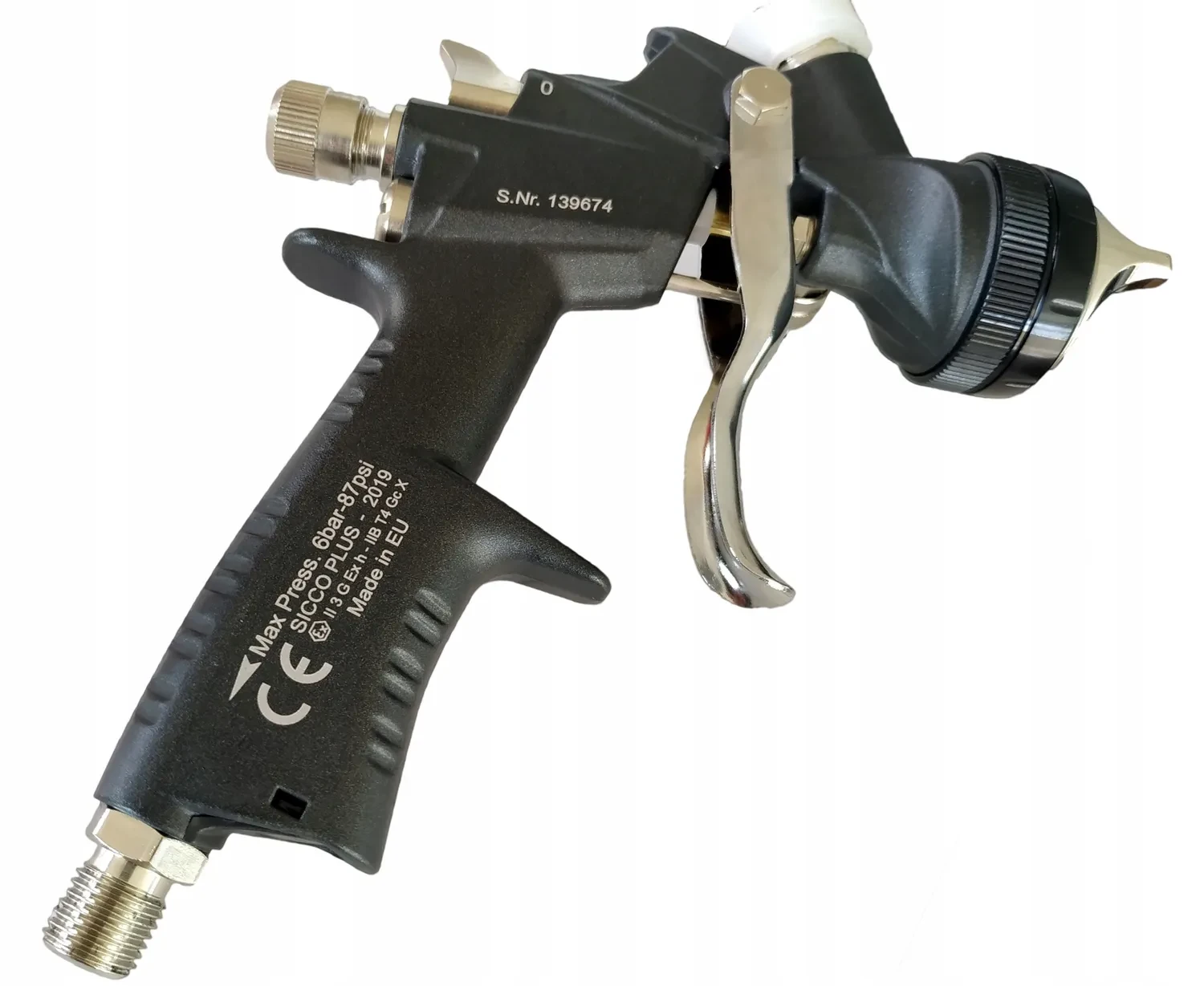 Pistolet lakierniczy HPS Plus Sicco jest odpowiednikiem - ANI F160 PLUS , to przyzwoitej jakości sprzęt w doskonałej cenie. Korpus wykonany z odlewu aluminium, nie jest to kute aluminium więc jest lżejszy od konkurentów. Korpus jest chropowaty i barwiony na czarno BLACK. Dysza iglica wykonana z materiałów niekorodujących. Uszczelka iglicy, uszczelka zbiornika, odporna na rozpuszczalnik. Zbiornik, kubek o pojemności 500ml kompatybilny z standardowymi filtrami do kubka. Doskonała ergonomia oraz balans pistolet po podpięciu węża doskonale się układa w dłoni, nie męczy i daje dużo swobody. Duży spust lekko reaguje na nacisk. Pokrętło regulacji szerokości strumienia znajduje się zboku po lewej stronie a zawór powietrza zasilającego nad pokrętłem ilości materiału na iglicy.